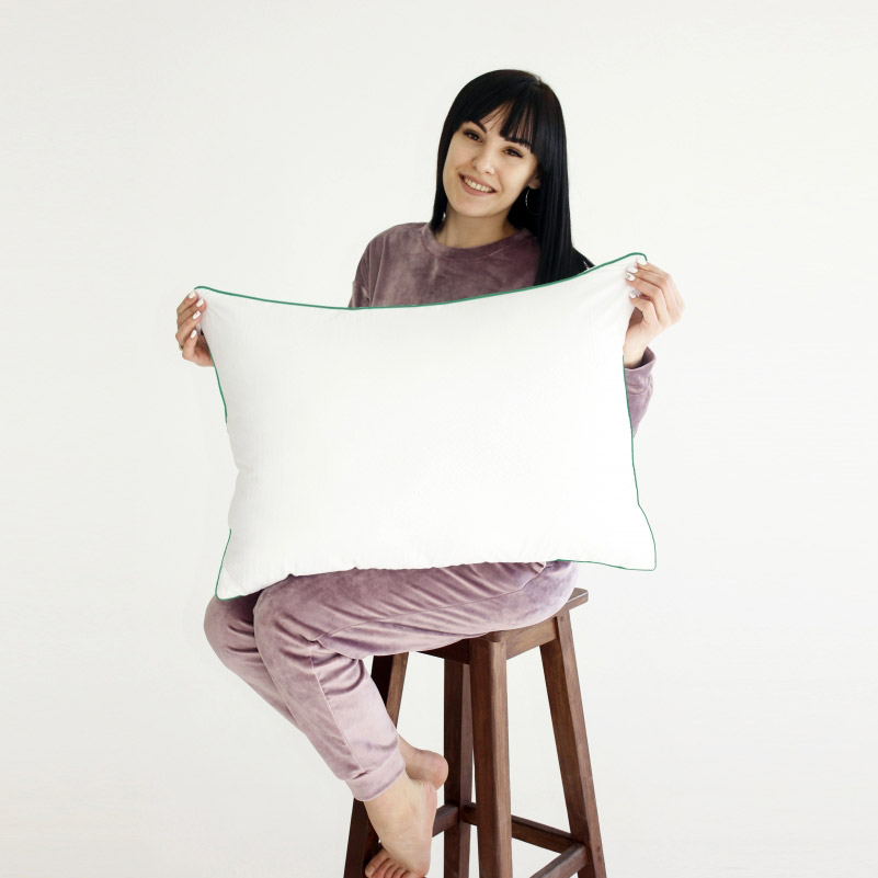 Універсальна подушка середньої висоти та м'якості з наповнювачем з вовни та поліефірного розпушувача. Вовняний наповнювач відмінно вбирає та випаровує надлишки вологи, добре пропускає повітря, створює здоровий та сухий мікроклімат під час сну, не збивається в процесі експлуатації. Спеціальне просочення екстрактом алое вера має антибактеріальні, регенеруючі та заспокійливі властивості. Чохол подушки виконаний із натуральної бавовняної тканини білого кольору із зеленим кантом. Тканина м'яка і приємна на дотик, добре пропускає повітря, проста у догляді. У подушці є вбудована блискавка, завдяки якій можна налаштувати кількість наповнювача.