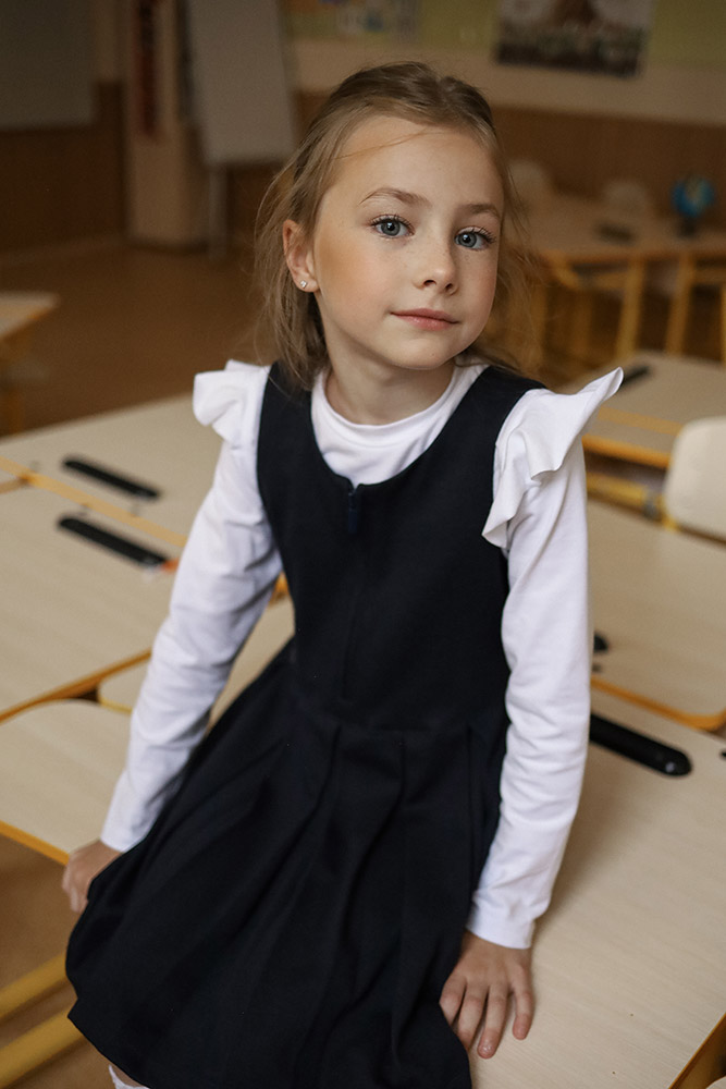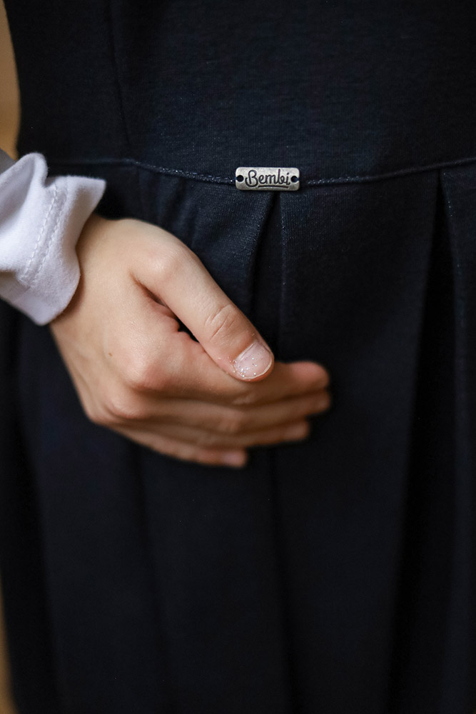 Однотонний шкільний сарафан темно-синього кольору. Модель довжиною до колін, зі складками і з центральною застібкою-блискавкою. Сарафан виконаний з трикотажної тканини джерсі. Матеріал приємний на дотик, якісний, практичний і довговічний в експлуатації, забезпечує затишок і комфорт.