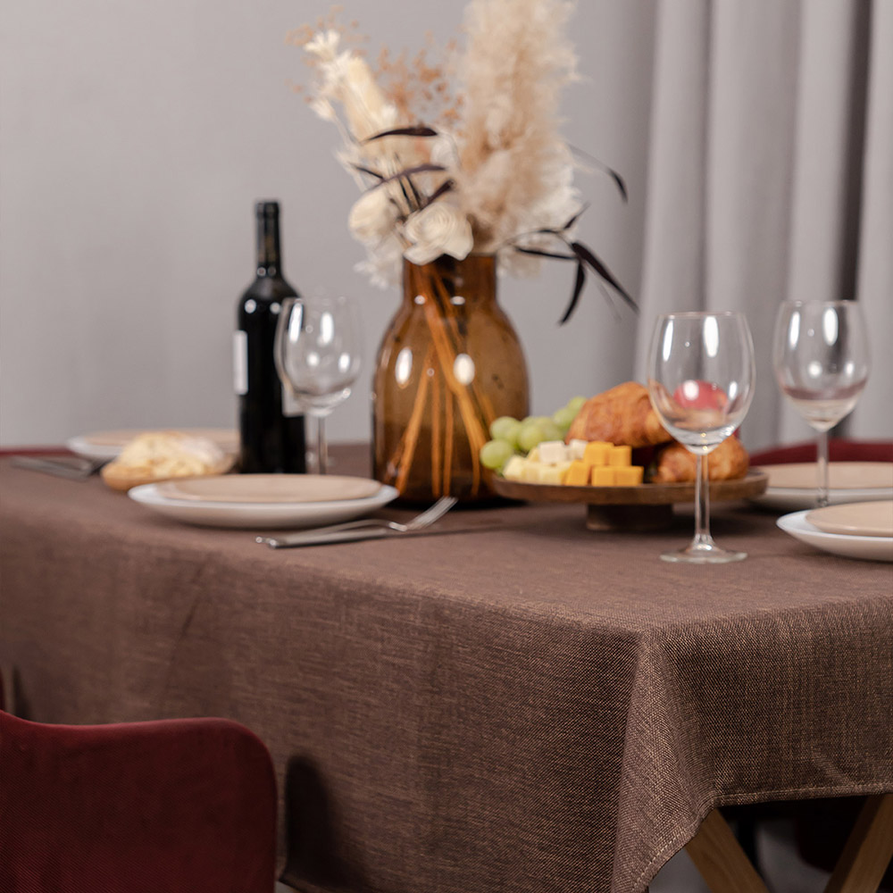 Скатертина Jordan - стильне і практичне рішення для сервірування столу. Скатертина виконана з міцної рогожки в однотонному дизайні коричневого кольору. Тканина щільна, з виразною текстурою, стійка до зносу, практична і довговічна в експлуатації, добре витримує часте прання. Скатертина ідеально підходить як для щоденного використання, так і для святкового застілля.