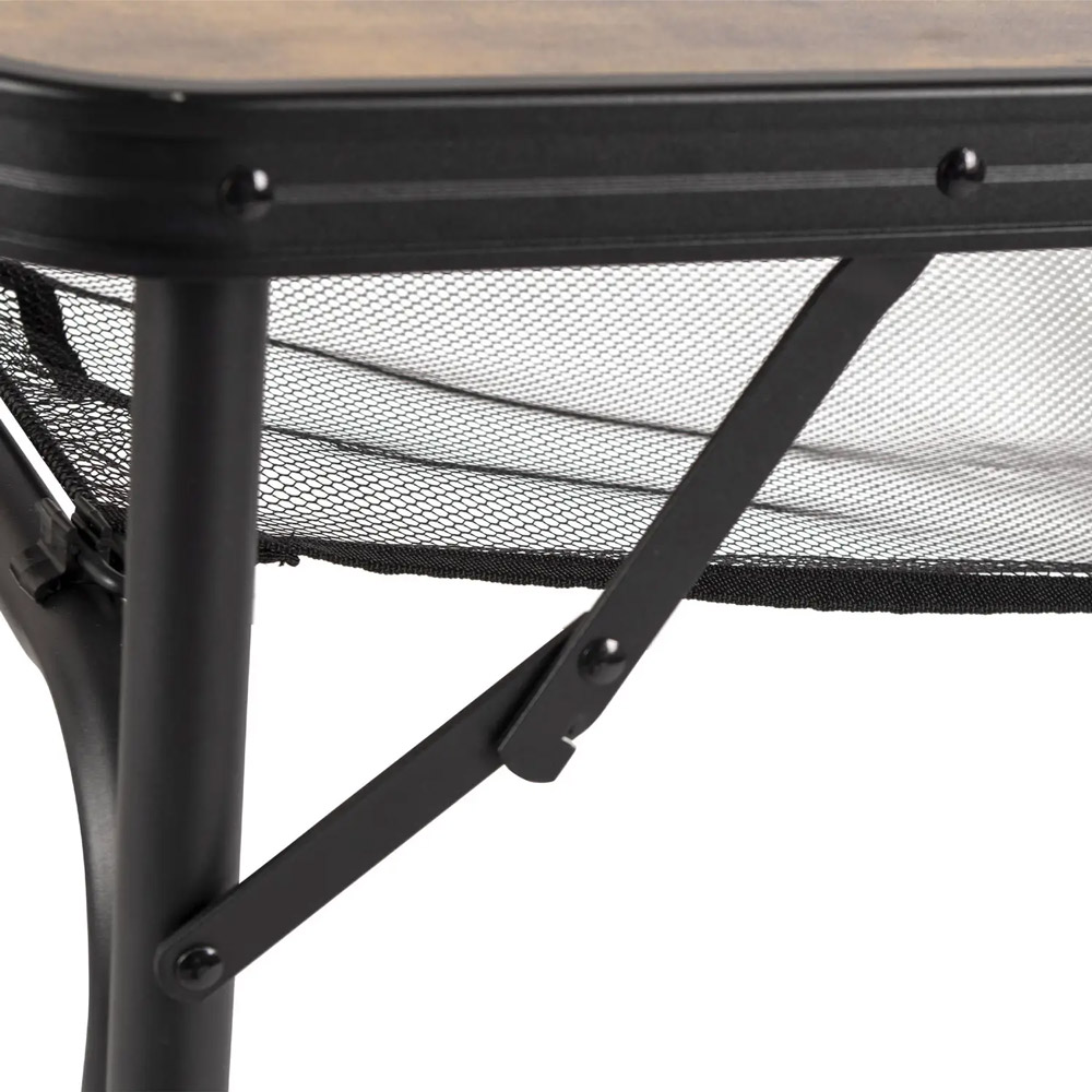 Стильний алюмінієвий стіл із дерев'яним ефектом, який легко регулюється по висоті для використання на нерівній поверхні. Він компактно складається у вигляді кейсу для зручного зберігання та перенесення. Додатково оснащений знімною сіткою під стільницею.
