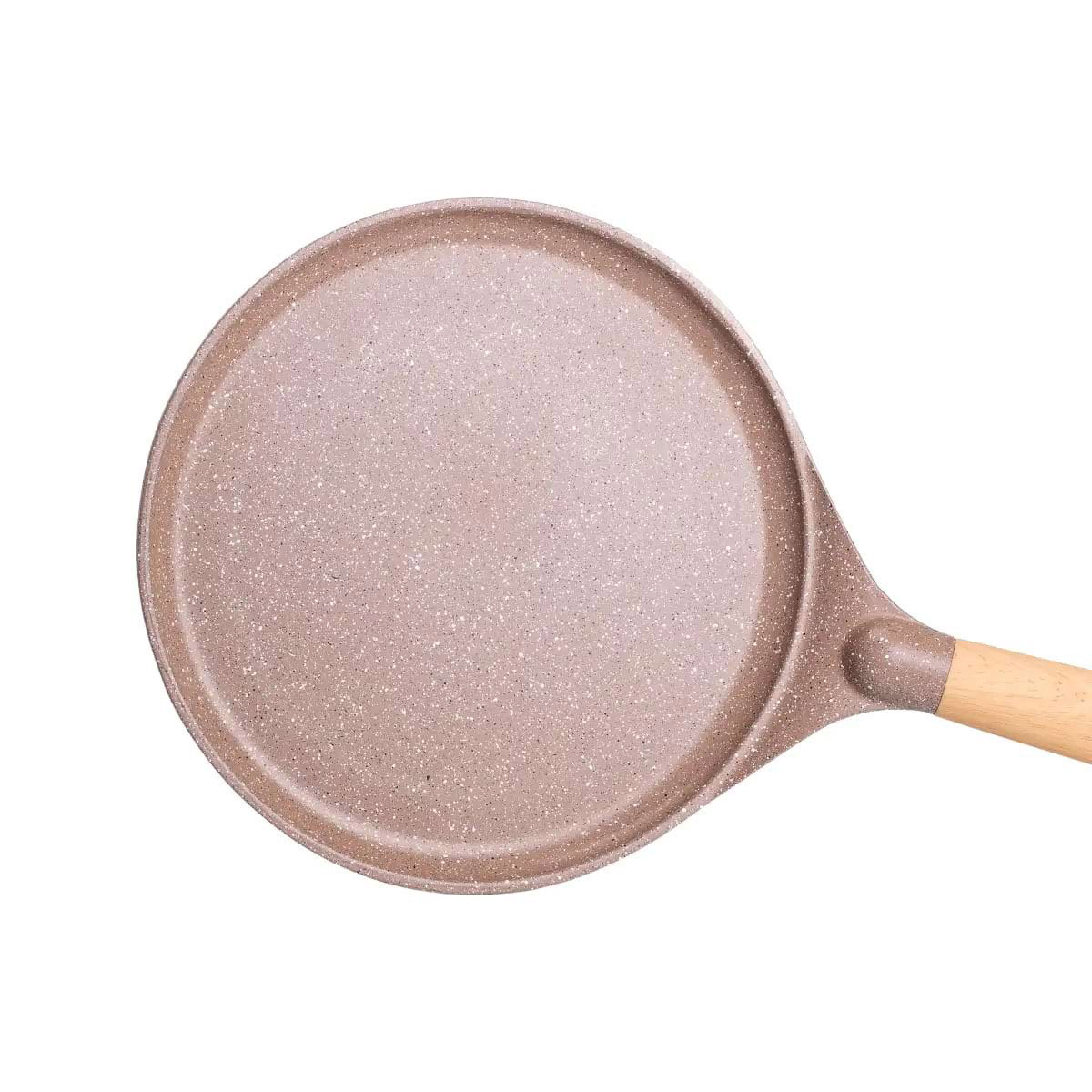Практична та функціональна сковорода для приготування великих млинців та оладок. Алюмінієвий корпус з мармуровим антипригарним покриттям забезпечує рівномірне нагрівання та запобігає прилипанню тіста. Низькі борти спрощують розподіл тесту та перевертання, а міцне дно робить її універсальною для використання на газових, електричних та індукційних плитах.