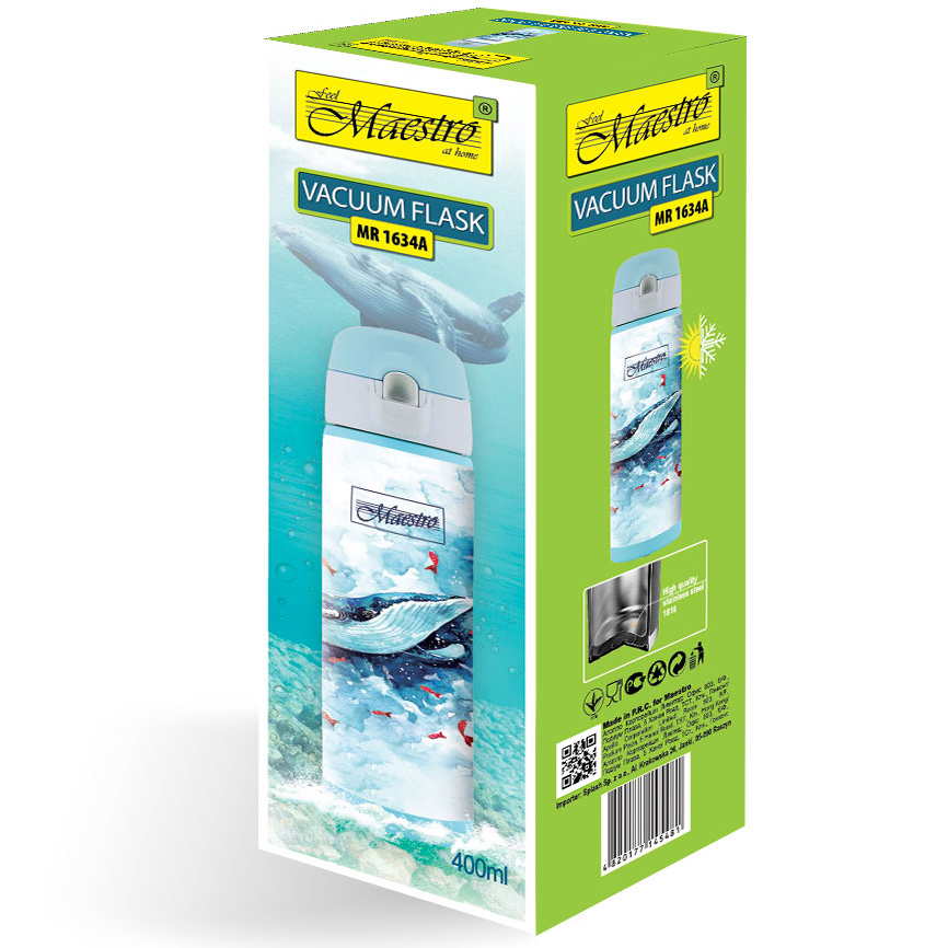 Термокружка 0,4л Синій кит Maestro MR1634-A виконана з високоякісних матеріалів в сучасному дизайні. Має ізольований вакуумний посудину. Ємність зручна в очищенні і догляді. Термокружка довго зберігає температуру.