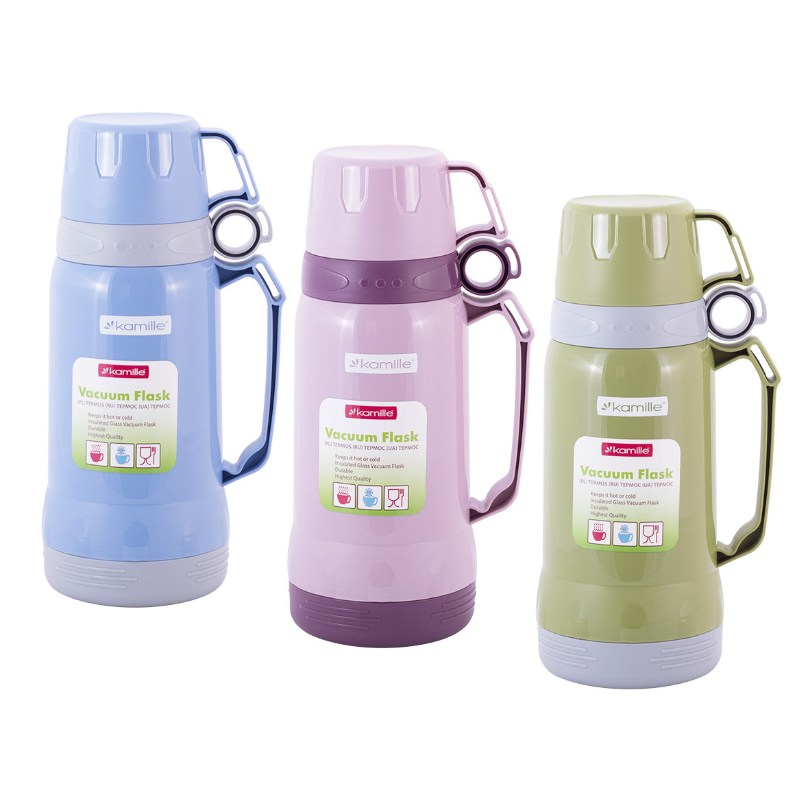 Термос Kamille 1000мл 2023 фіолетовий пластиковий зі скляною колбою має високу якість, надійність, компактні розміри та естетичний дизайн. Такий термос стане незамінним у машині, на відпочинку чи подорожі. особливості: