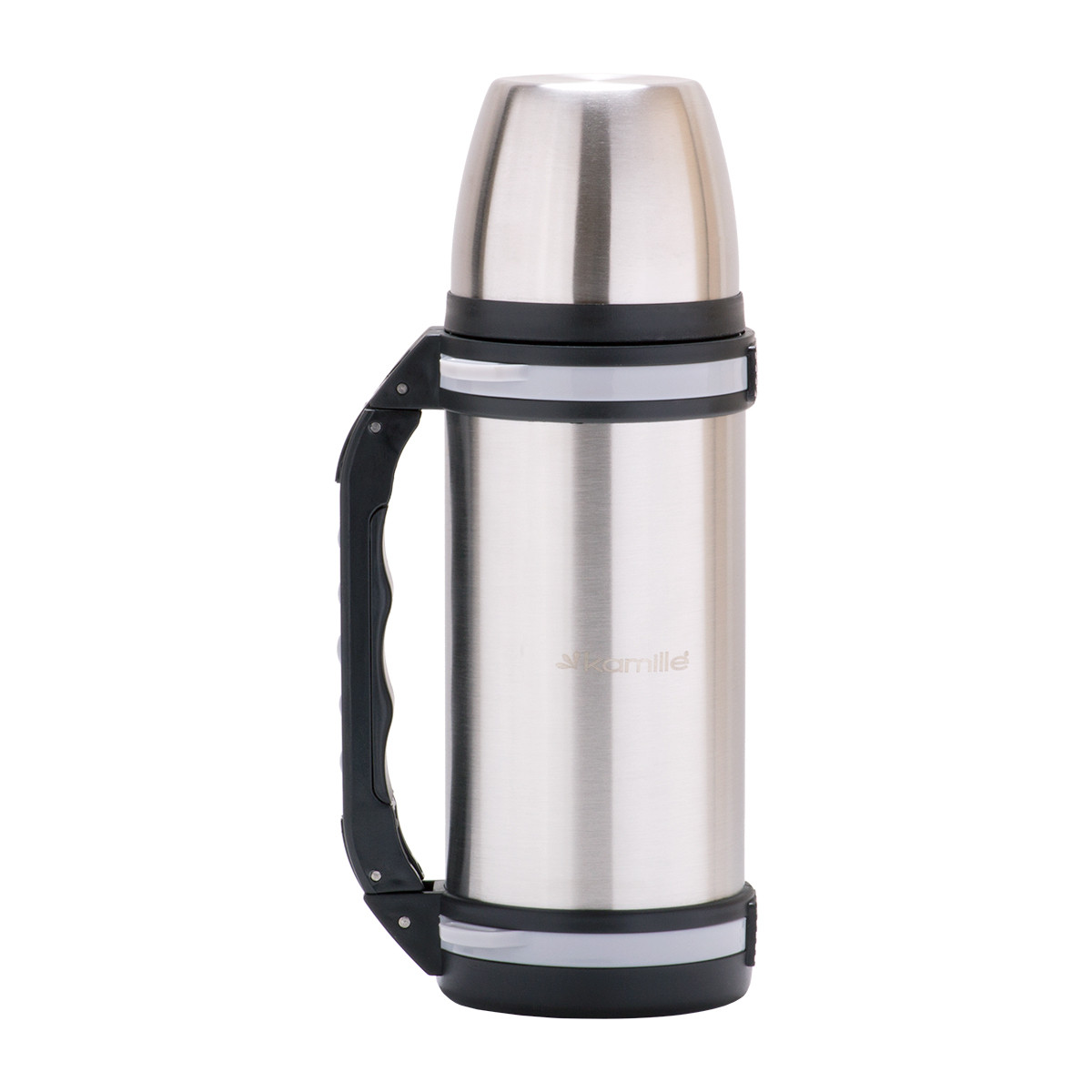 Термос Kamille 1000мл 2090 з нержавіючої сталі з ручкою та ремінцем має високу якість, надійність, компактні розміри та естетичний дизайн. Такий термос стане незамінним у машині, на відпочинку чи подорожі.