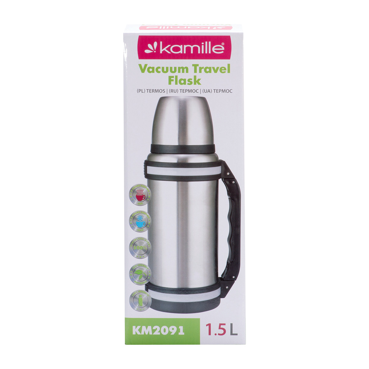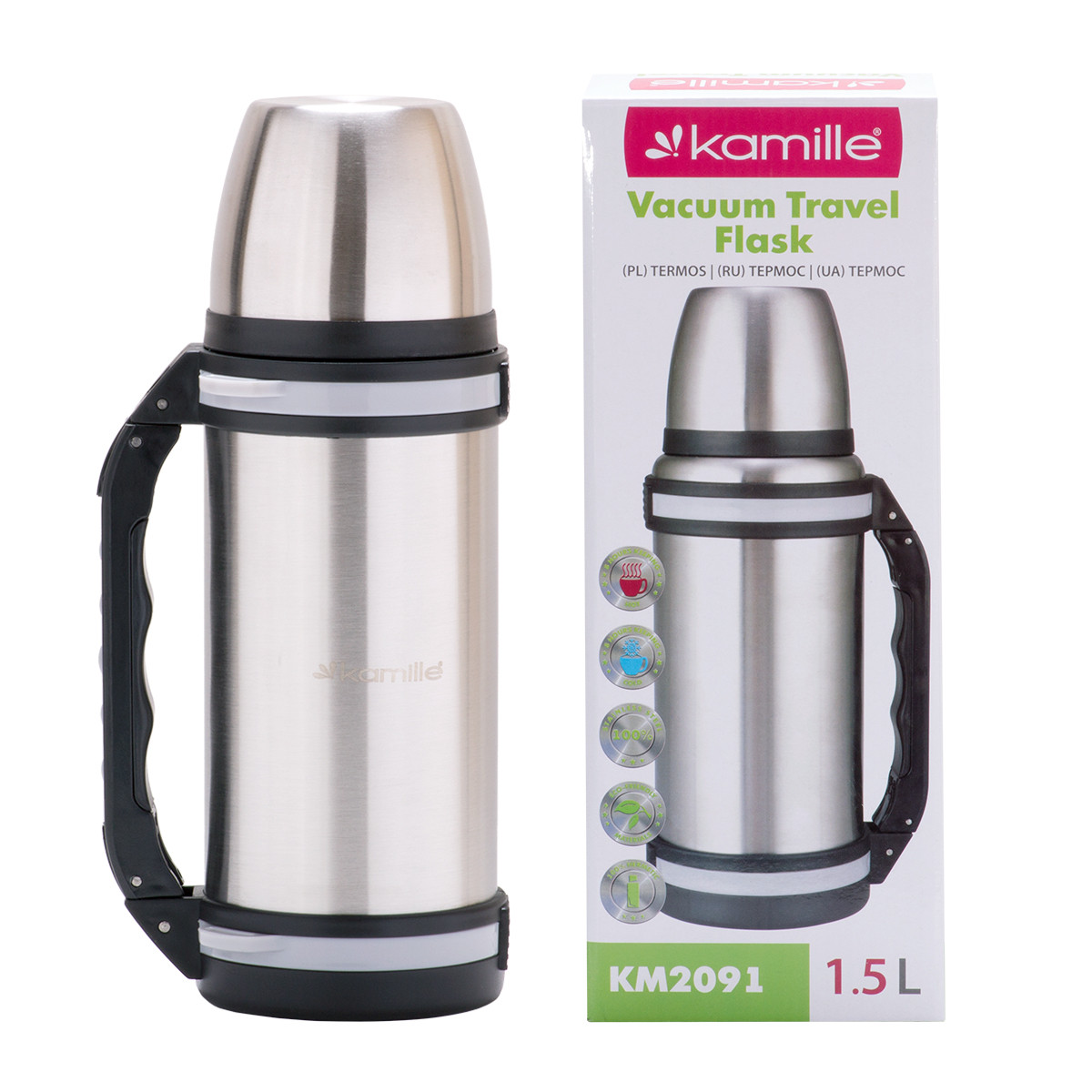 Термос Kamille 1500 мл 2091 з нержавіючої сталі з ручкою та ремінцем має високу якість, надійність, компактні розміри та естетичний дизайн. Такий термос стане незамінним у машині, на відпочинку чи подорожі.
