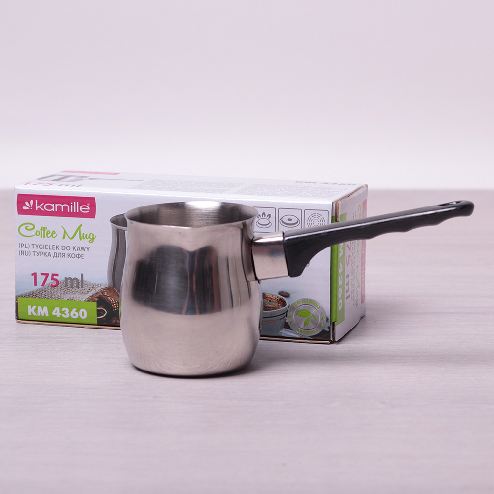Турка для кави Kamille 175мл з нержавіючої сталі 4360 використовується для приготування кави по-східному. Ємність має зручну пластикову жароміцних ручку і традиційну форму - широке дно, звужене горлечко з носиком. Невеликий обсяг турки робить напій ще духмяний і смачний. Виріб виконаний з безпечної нержавіючої сталі відмінної якості. Під торговою маркою Kamille випускаються високоякісні товари та приладдя для кухні. Практична корисна посуд принесе у Вашу кухню зручність і комфорт. Вироби від Kamille мають високу зносостійкість, надовго зберігаючи свій початковий вигляд і функціональність. Посуд поєднує в собі відмінні технічні характеристики і зручний ультрасучасний дизайн.