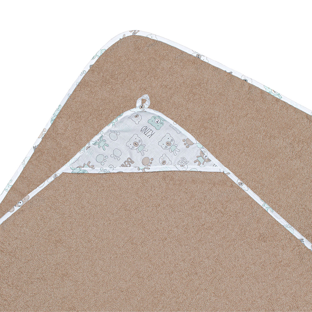 М'який і ніжний рушник-куточок з махрової тканини, ідеально підходить для догляду за шкірою дитини після купання. Рушник бежевого кольору, прикрашений білою вставкою-куточком з принтом з ведмедиками. Рушник з натуральної бавовни з м'яким ворсом, відмінно вбирає вологу, швидко сохне і забезпечує дитині комфорт.