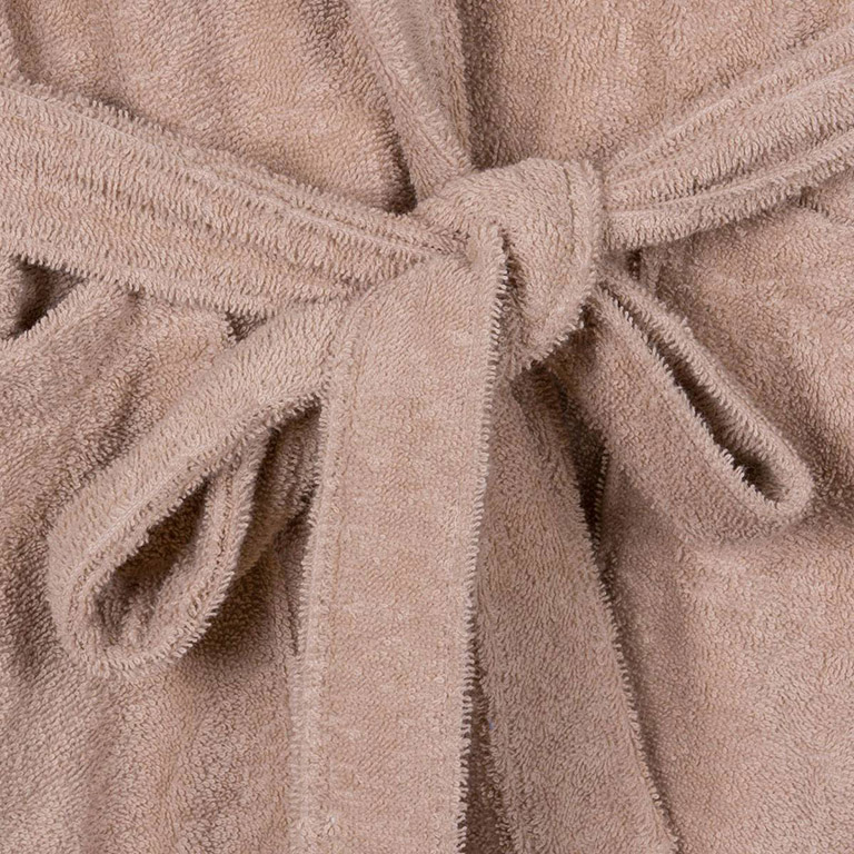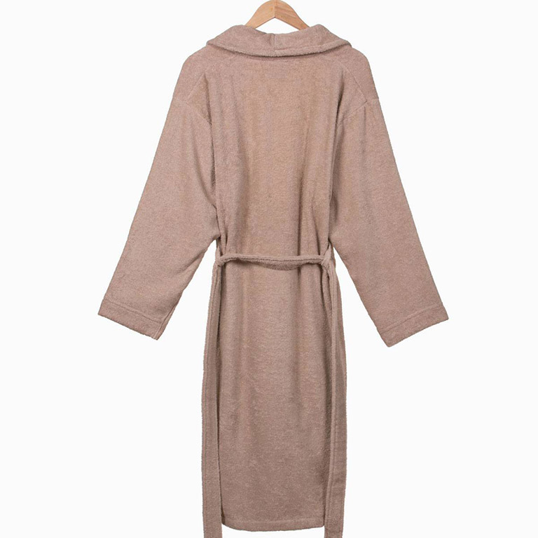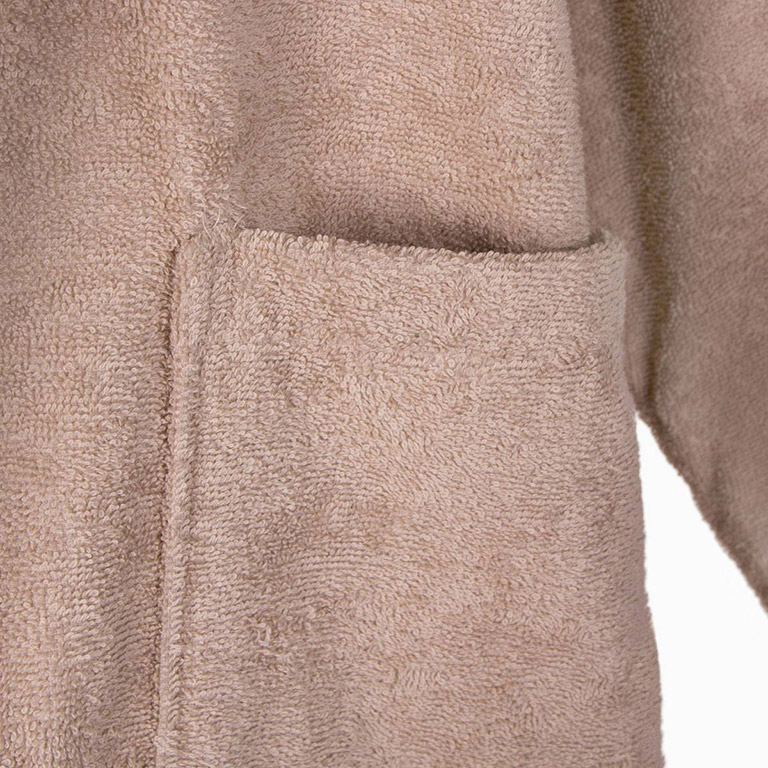 Однотонний махровий халат бежевого кольору з шалевим коміром і кишенями. Халат універсальний, в класичному дизайні, виконаний з натуральної бавовни, стане незамінним у вашому домашньому гардеробі.