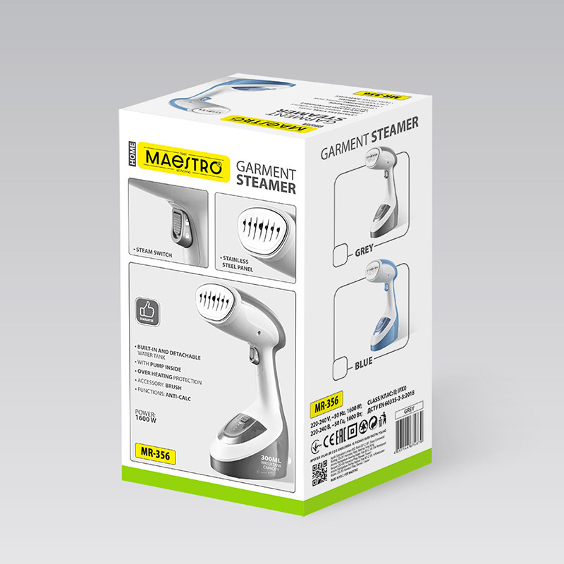 Вбудований знімний резервуар для води об'ємом 300 мл зручний у використанні і дозволяє обробляти більше речей без частого доливання. Внутрішній насос забезпечує стабільну подачу пари, а захист від перегріву робить експлуатацію безпечною. Функція антинакип продовжує термін служби пристрою, а щітка в комплекті допомагає ефективно доглядати за верхнім одягом і щільними тканинами.