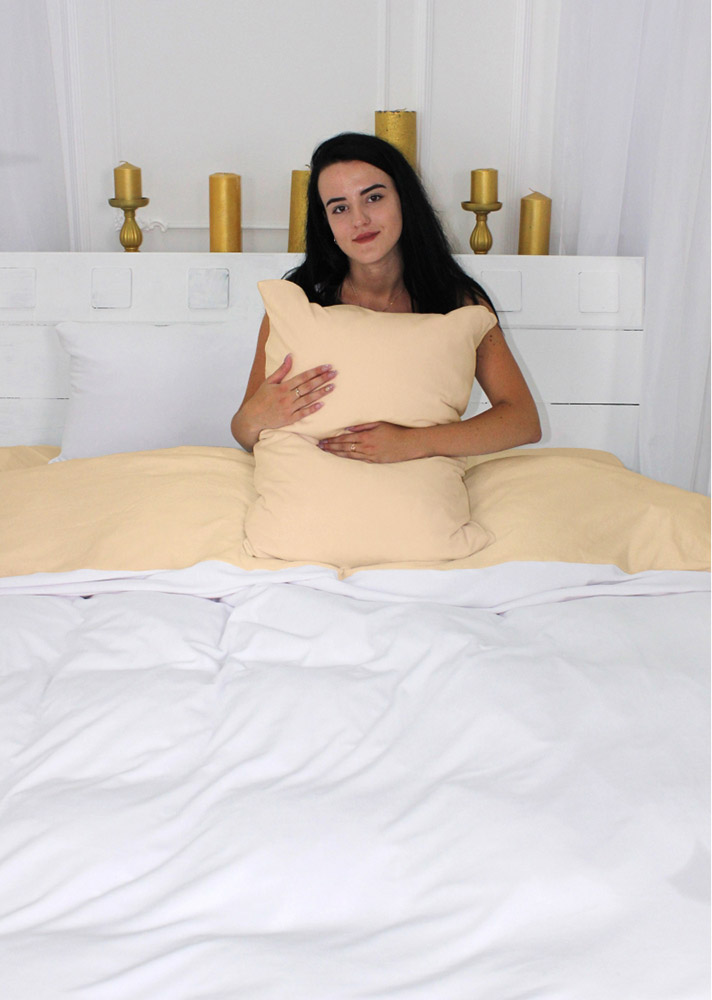 - Двоспальний євро комплект: підковдра 200х220 см (1 шт), простирадло 180х200 (+25) см на резинці (1 шт), наволочки 50х70 см (4 шт)