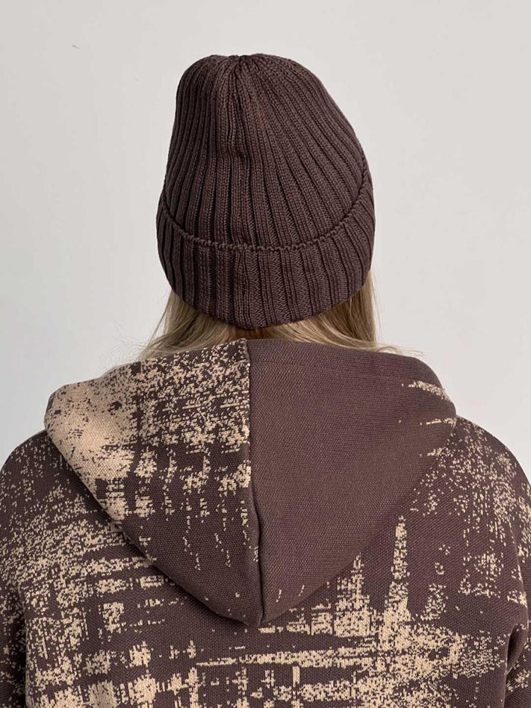 Стильна однотонна в'язана шапка шоколадного кольору. Шапка універсального розміру, затишна і комфортна, підійде для повсякденного носіння. Пряжа з бавовни та акрилу приємна до тіла, тепла, водночас практична і довговічна в експлуатації.