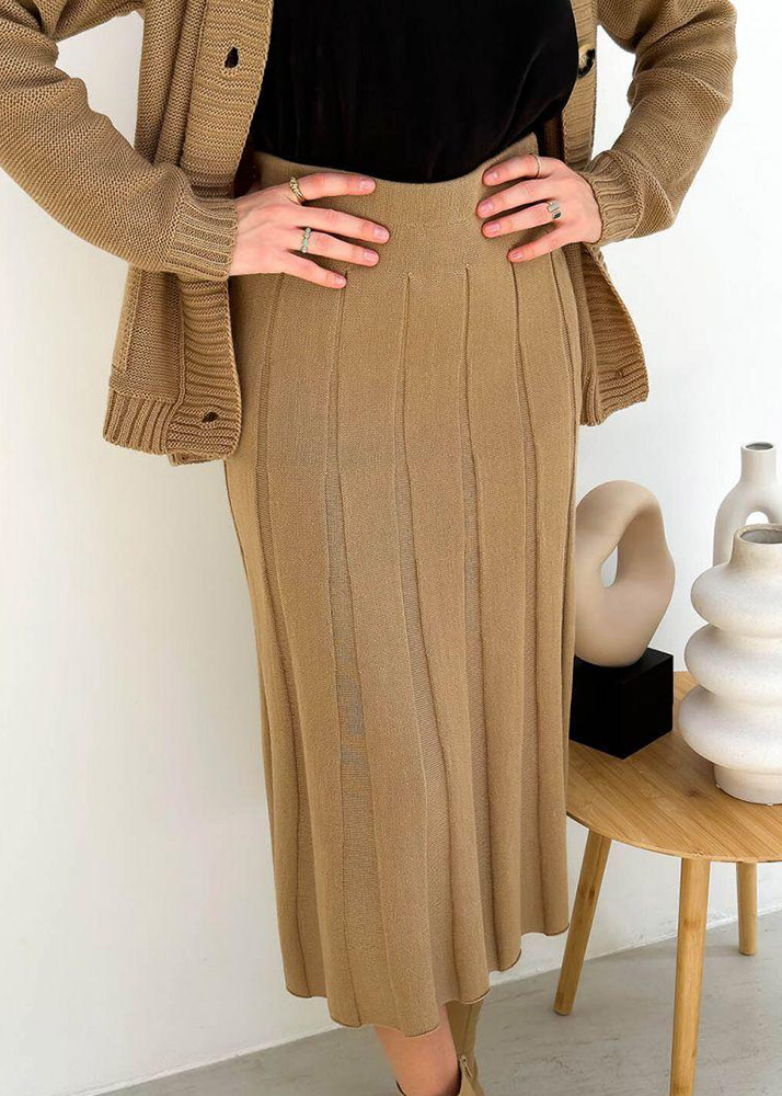 Стильна спідниця плісе кольору капучино. Спідниця довга, машинної в'язки, чудово підійде для повсякденного носіння, стане гарним акцентом у гардеробі. Однотонний дизайн робить спідницю універсальною, легко поєднується з іншим одягом і аксесуарами. Пряжа з натуральної вовни та акрилу приємна до тіла, тепла і затишна, забезпечує комфорт, водночас міцна і довговічна в експлуатації.