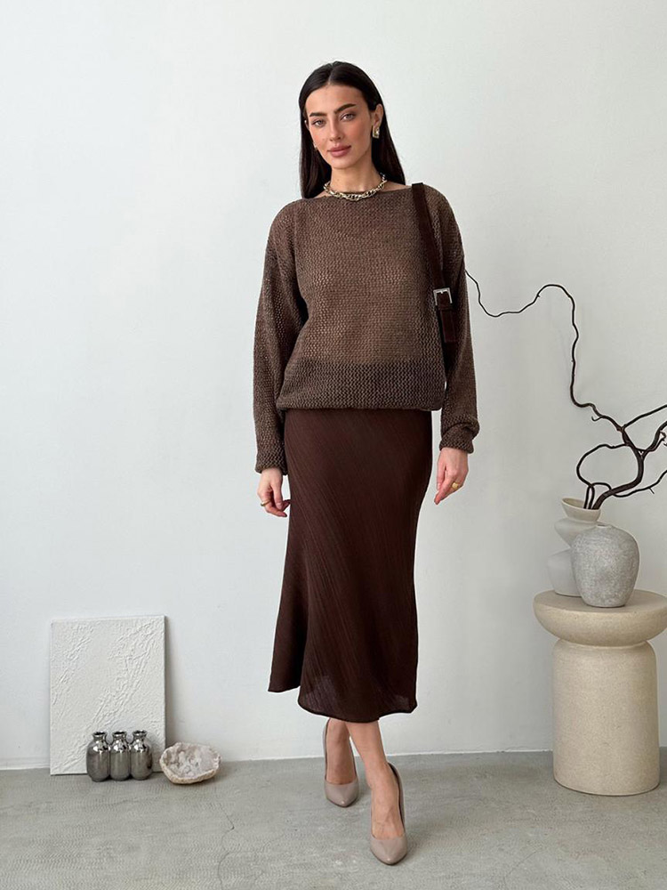 Стильна в'язана спідниця шоколадного кольору. Модель довжини міді, пояс на гумці. Спідниця стане красивим акцентом у гардеробі. Однотонний дизайн робить спідницю універсальною, легко поєднується з іншим одягом і аксесуарами. Пряжа з віскози та акрилу приємна до тіла, забезпечує комфорт, водночас міцна та довговічна в експлуатації.