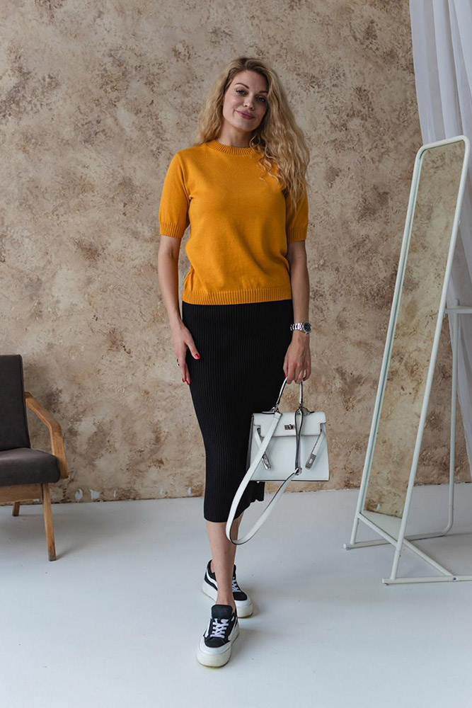 Однотонна трикотажна спідниця чорного кольору. Модель машинної в'язки, з красивими рельєфними смужками, добре виглядає на будь-якій фігурі. Спідниця зручна і практична, відмінно підійде для повсякденного носіння і стане стильним акцентом у гардеробі. Спідниця виконана з м'якого якісного матеріалу на основі бавовни та акрилу.