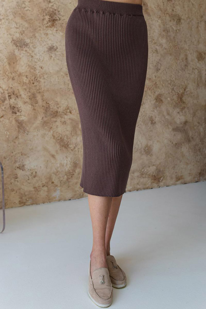 Однотонна трикотажна спідниця шоколадного кольору. Модель машинної в'язки, з красивими рельєфними смужками, добре виглядає на будь-якій фігурі. Спідниця зручна і практична, відмінно підійде для повсякденного носіння і стане стильним акцентом в гардеробі. Спідниця виконана з м'якого якісного матеріалу на основі бавовни та акрилу.