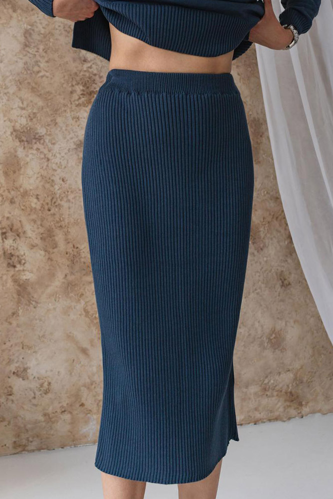 Однотонна трикотажна спідниця синього кольору. Модель машинної в'язки, з красивими рельєфними смужками, має гарний вигляд на будь-якій фігурі. Спідниця зручна і практична, відмінно підійде для повсякденного носіння і стане стильним акцентом у гардеробі. Спідниця виконана з м'якого якісного матеріалу на основі бавовни та акрилу.