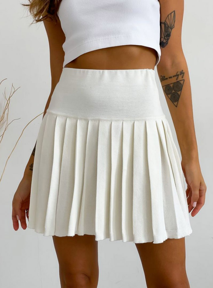 Трикотажна однотонна спідниця ніжного молочного кольору з красивими складками. Модель коротка, зручна та практична, стане стильним акцентом у жіночому гардеробі. Матеріал м'який та приємний на дотик, комфортний, виконаний з натуральної бавовняної пряжі високої якості.