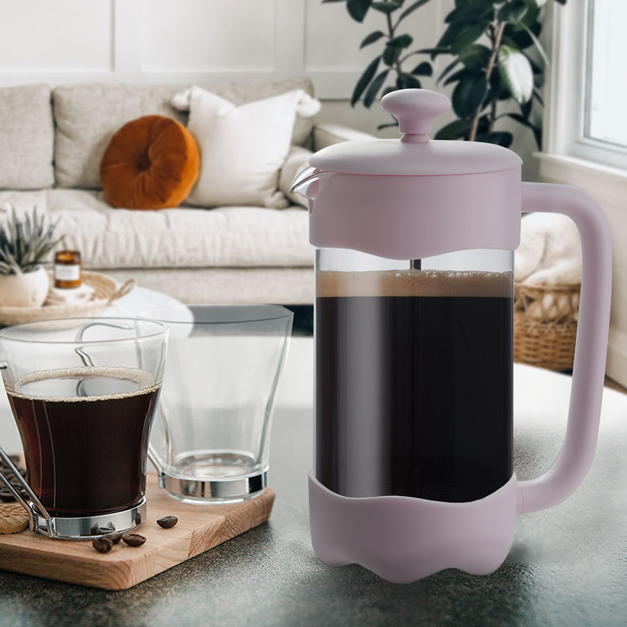 Френч-прес 1,0л Maestro MR1669-1000 рожевий. Оснащений металевим механізмом відокремлення твердого залишку. Колба виготовлена з жароміцного боросилікатного скла.