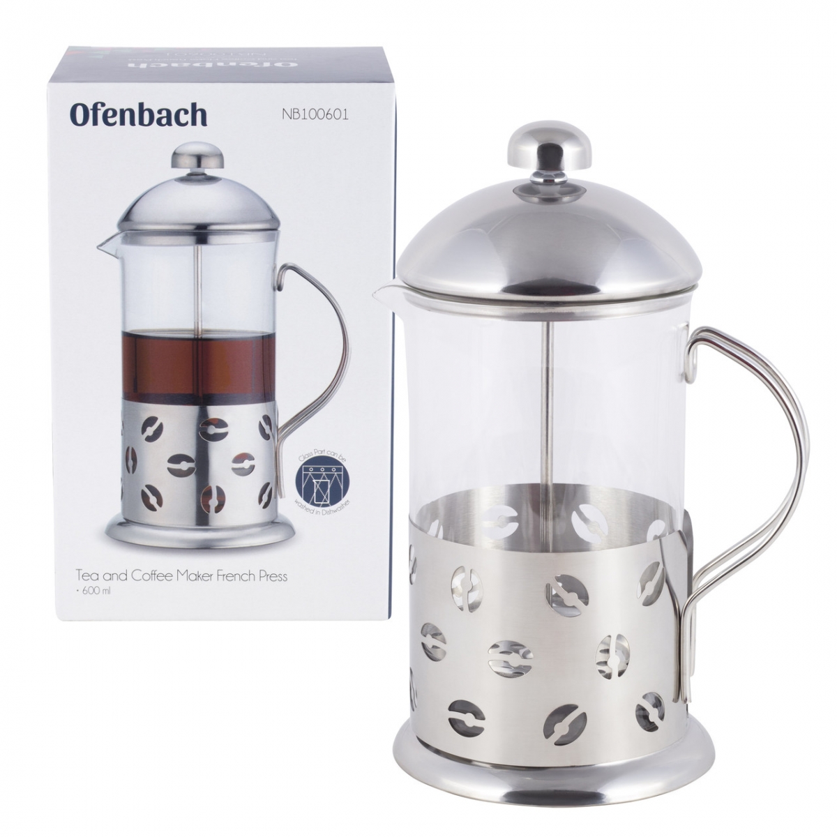 Френч-прес для чаю та кави 600мл Ofenbach 100601. Скляну частину можна мити в посудомийній машині. Не ставити на відкритий вогонь чи пальник. Вимити гарячою водою та висушити перед використанням. Не використовувати гострі металеві предмети та абразивні миючі засоби для чищення.