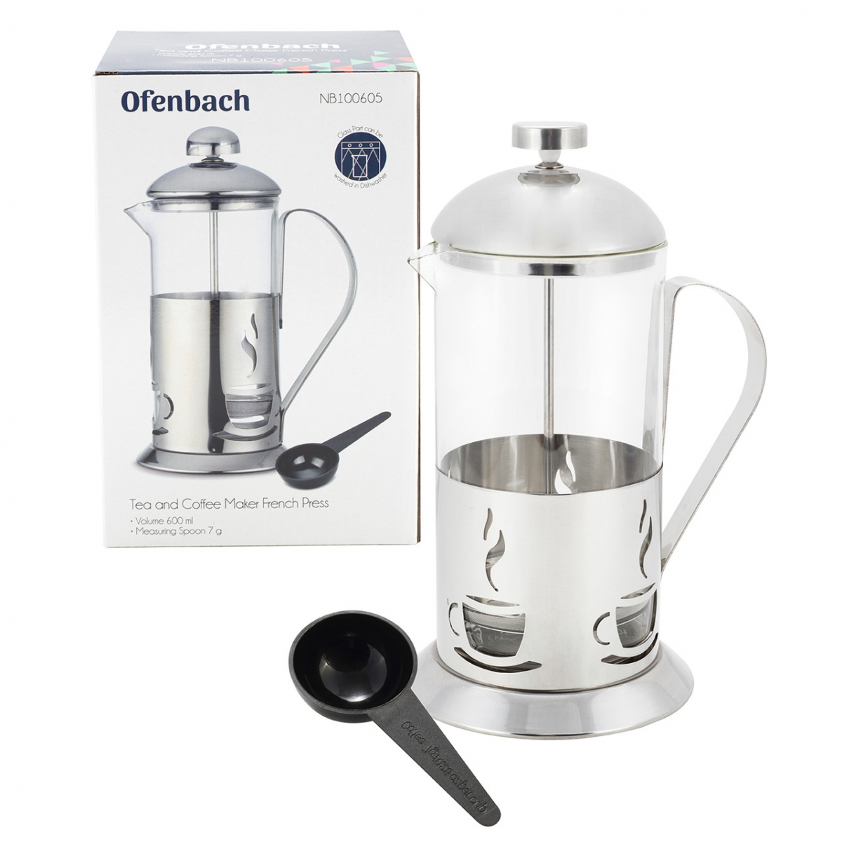 Френч-прес із мірною ложкою 600мл Ofenbach 100605. Місткий, добрий заварник для улюбленого напою. Мірна ложка у комплекті. Скляна колба підходить для посудомийної машини.