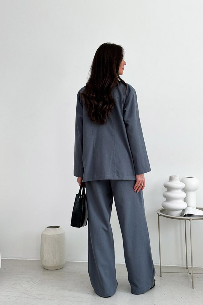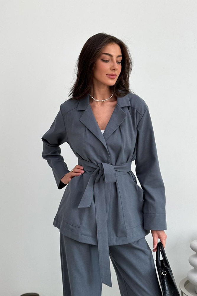 Стильний однотонний піджак графітового кольору. Піджак вільного крою, з двома накладними кишенями. Піджак фіксується ґудзиком, лінію талії можна підкреслити знімним поясом.