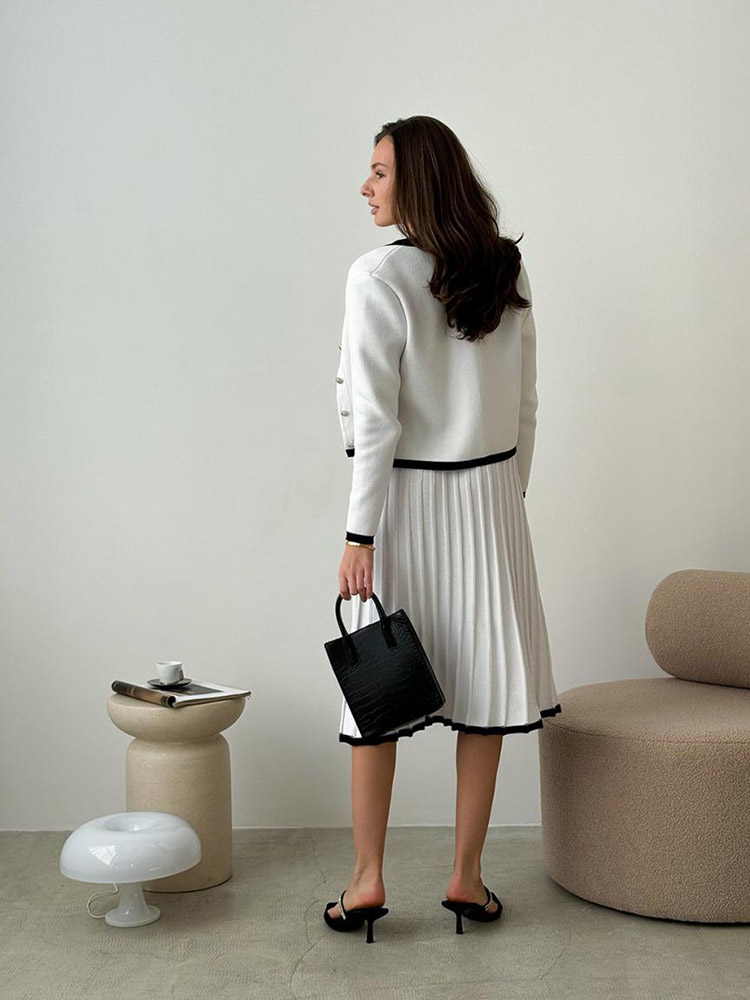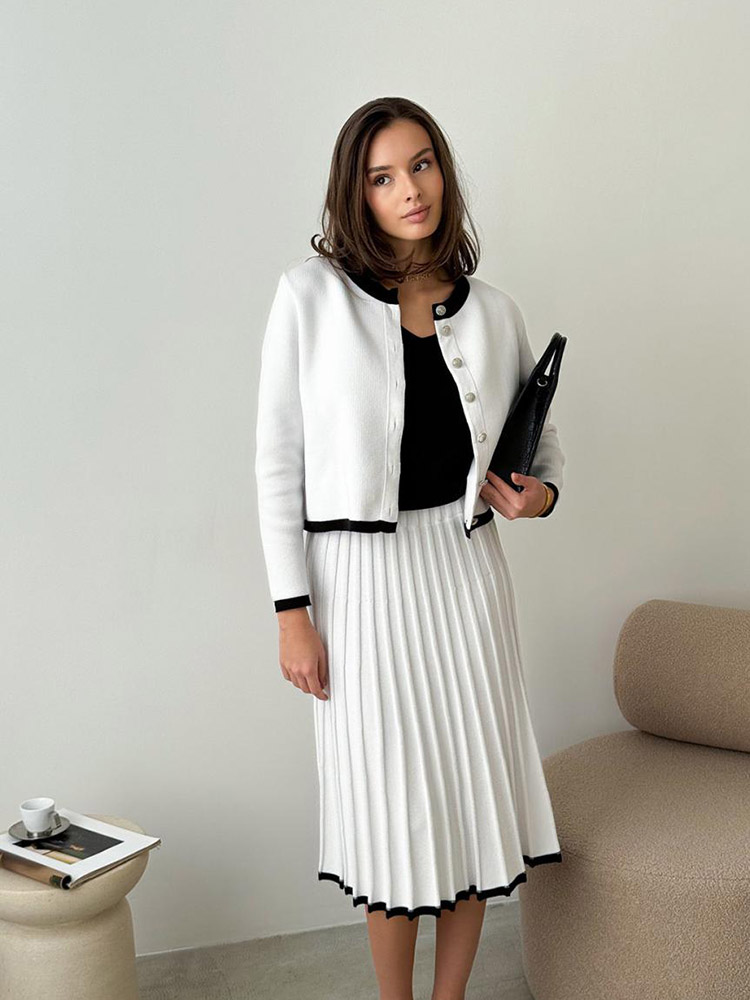 Елегантний жіночий в'язаний жакет у стилі Old Money - втілення витонченості та класики. Жакет виконаний з м'якої пряжі на основі бавовни та акрилу. Білий колір з витонченими чорними акцентами підкреслює благородство образу. Цей жакет стане ідеальним вибором для поціновувачок елегантного стилю і бездоганної якості.