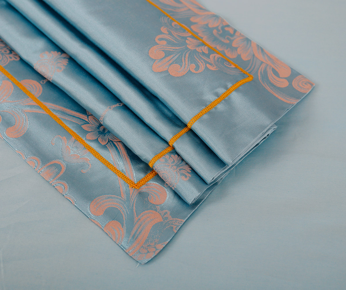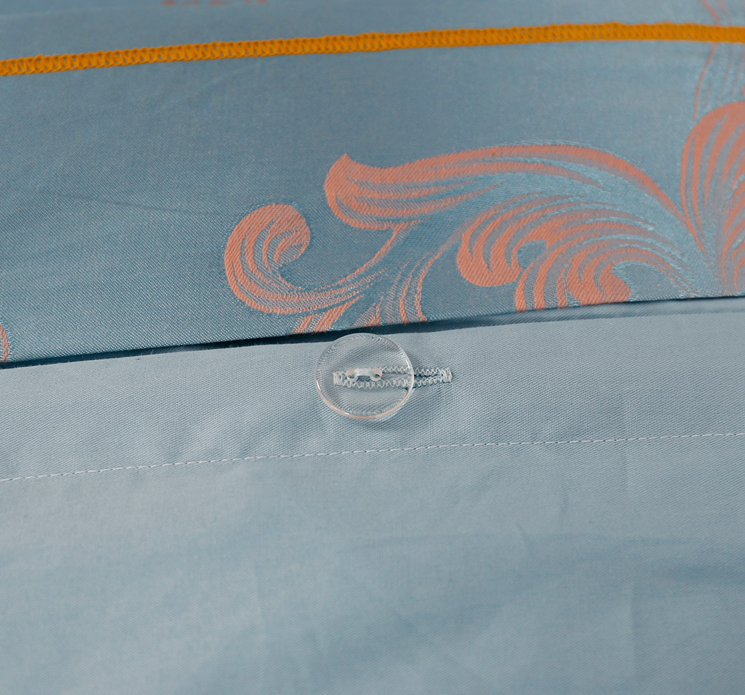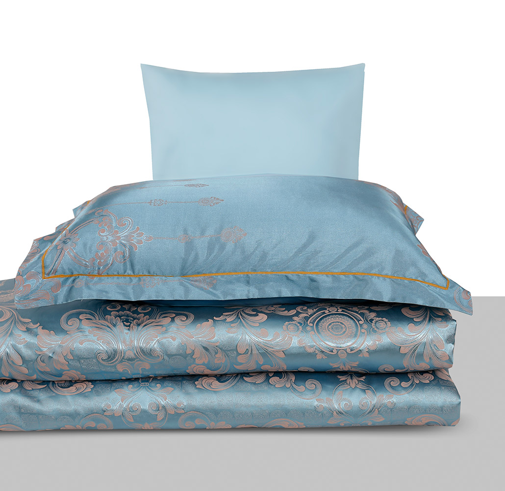 Чудовий комплект блакитного кольору із вишуканим жакардовим рослинним візерунком. Постільна білизна стане ніжним та красивим акцентом у спальні, освіжить інтер'єр, зробить кімнату затишною та неповторною. Комплект м'який та шовковистий на дотик, виконаний з волокон модалу та бавовни, подарує максимально комфортний та приємний сон.
