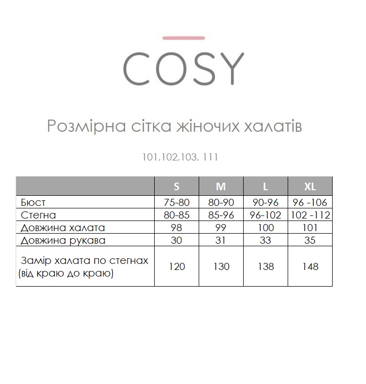 Вся інформація щодо догляду за виробом вказана на бирці. COSY – український бренд одягу та текстилю для дому. Компанія виробляє високоякісні вафельні халати та рушники, а також халати та піжами з мусліну. Велика увага приділяється якості виготовлення кожної моделі. М'які натуральні тканини, сучасний лаконічний крій, старанність у деталях – все це сприяє зручності та відчуттю затишку. COSY хоче привнести у повсякденне життя людей більше краси, затишку та комфорту. Ці товари для тих, хто любить свою сім'ю, своїх близьких, свою оселю. COSY – затишок та комфорт щодня!