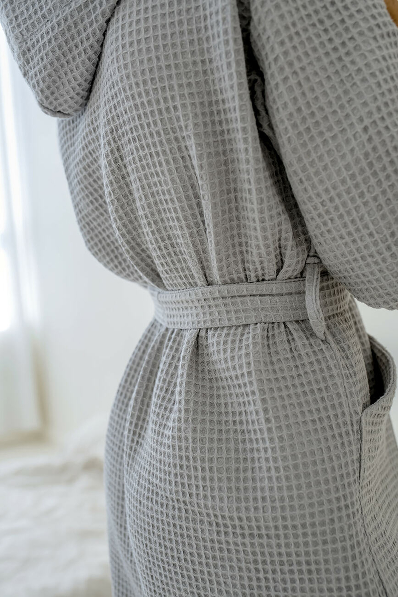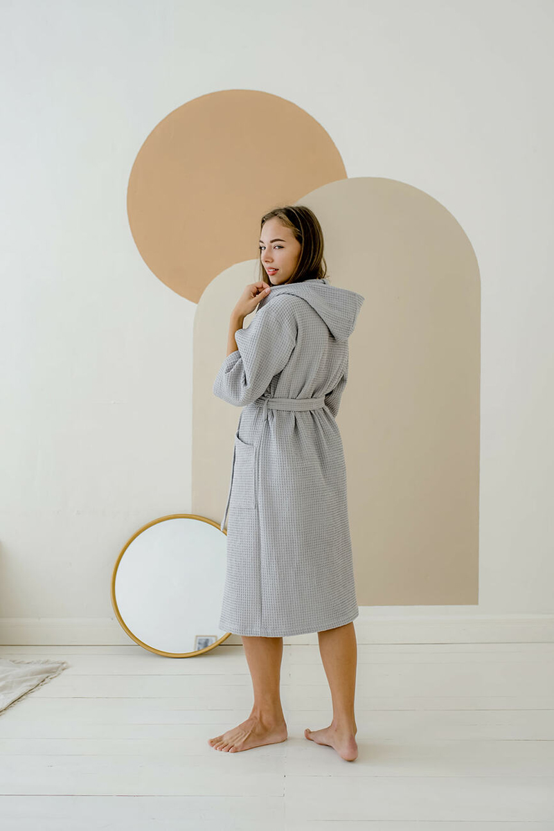 Халат жіночий вафельний з капюшоном Cosy сірий. Вафельний халат з капюшоном, особливо зручний для тих, хто має довге волосся. Структура тканини халата дозволяє швидко висушити волосся та тіло. Вафельний халат доповнений зручним капюшоном.