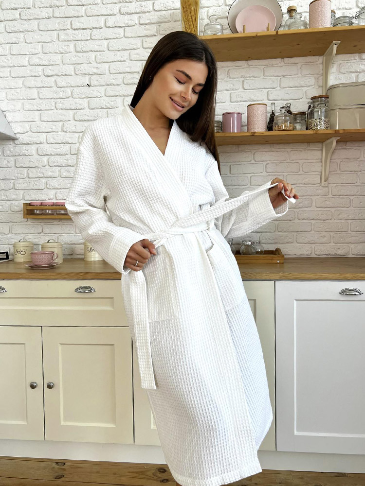 Однотонний халат-кімоно білого кольору. Модель із поясом і зручними накладними кишенями. Халат виконаний з легкої та м'якої тканини з рельєфною вафельною текстурою. Матеріал з натуральної бавовни, приємний на дотик, чудово пропускає повітря, дарує відчуття затишку і комфорту.