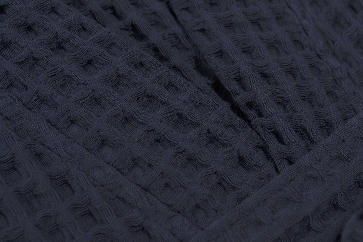 Жіночий халат-кімоно темно-синього кольору з рельєфною вафельною фактурою, кишенями і поясом. Халат легкий і комфортний, виконаний з натуральної бавовняної тканини високої якості. Виріб стане стильним акцентом у домашньому гардеробі, подарує комфортний відпочинок у затишній обстановці.